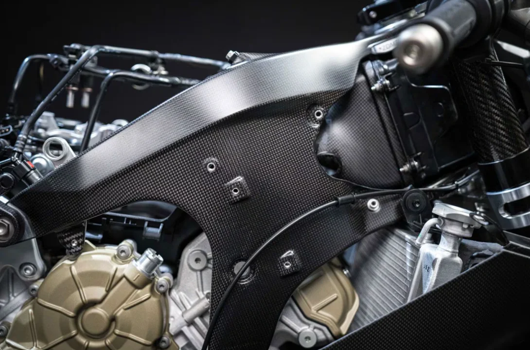 Karbon fiber şasi ve jantlar sayesinde motosiklet, inanılmaz bir güç/ağırlık oranına ulaşır. Bu da hem hızlanmada hem de yön değiştirmede büyük avantaj sağlar.